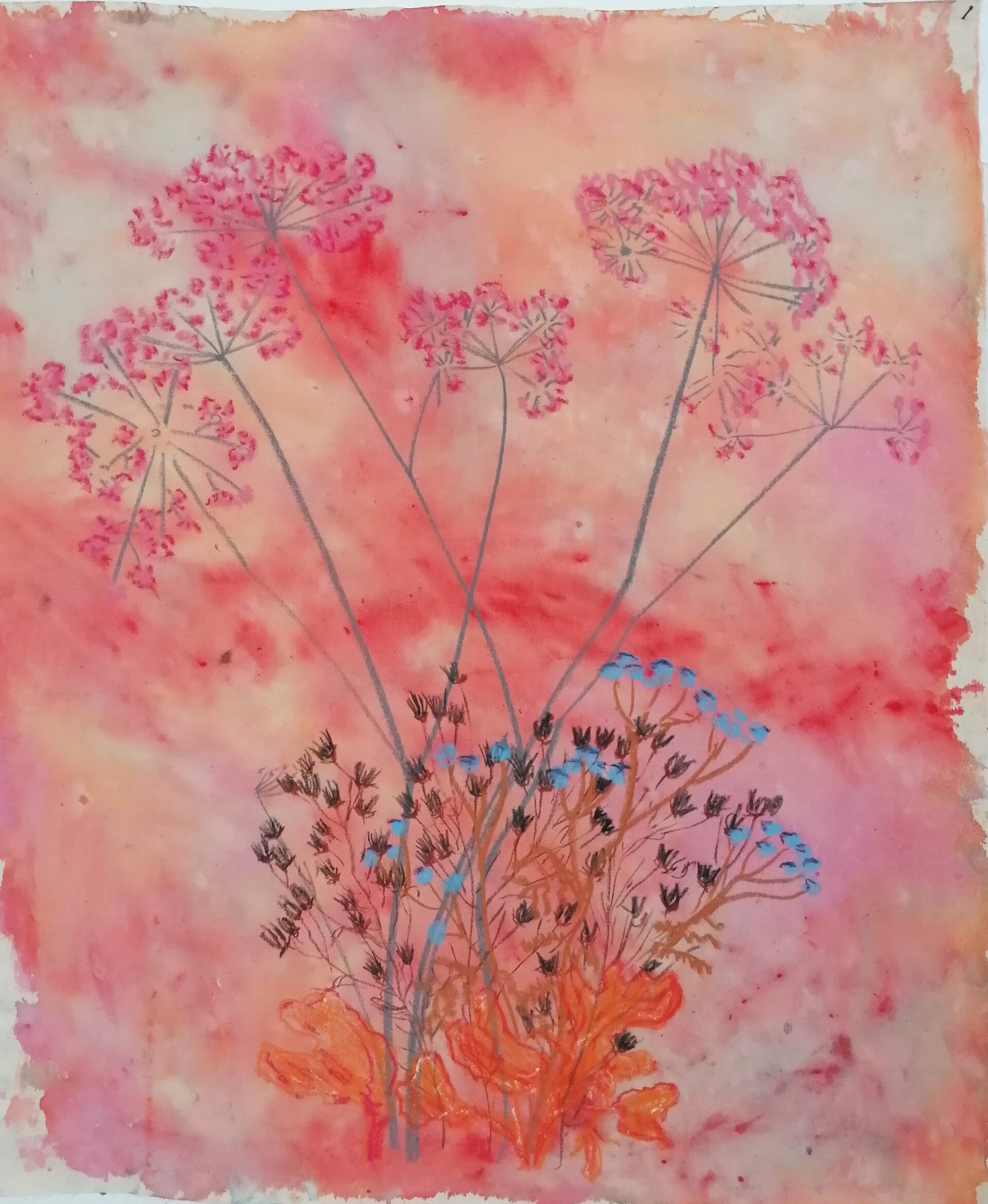 Während meiner Zeit in Bispingen möchte ich meine Arbeit mit dem Titel „Woher weißt du, dass du im Augenblick nicht träumst?“ umsetzen. In ihr erforsche ich die komplexe Beziehung zwischen Mensch und Natur. In der naturnahen Umgebung des Hofs Scharrlberg finde ich Blumen und Pflanzen, die ich zu Stillleben arrangiere. Sie bilden mein Ausgangsmaterial. Auf großformatigen Papierbögen und unbespannten Leinwänden werden diese mit einer invertierten Farbigkeit gezeichnet und gemalt. Die invertierte Farbgebung kennen wir vom Negativ-Material der analogen Farbfotografie. Im weiteren Schritt werden die Malereien digital fotografiert und erneut invertiert. Dadurch erhalten sie ihre ursprünglichen Farbigkeit zurück, jedoch verfremdet und intensiviert. Diese Herangehensweise symbolisiert für mich das Fortschreiten der Digitalisierung der Welt.Die Grenzen zwischen real und digital erzeugtem sind schwerer identifizierbar und verschwimmen miteinander. KI gestützte Bilder sind ein Teil unserer Alltags geworden. Gleichzeitig gibt es eine Rückbesinnung naturbelassene Lebensräume zu schaffen. Mit „Woher weißt du, dass du im Augenblick nicht träumst?“ möchte ich eine visuelle Erzählung schaffen, die dieses zwiespältige Verhältnis zwischen Mensch und Naturthematisiert.