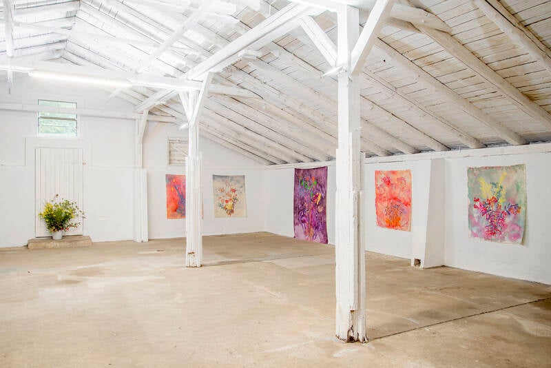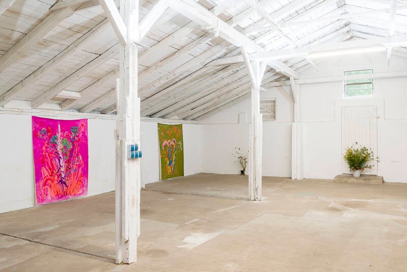 Ich durfte die große Halle als meinen Arbeits- und Ausstellungsraum nutzen und der Vibe eines Ateliers in Long Island der frühen 60er Jahren hat mich sofort inspiriert und zu einer lockeren Arbeitsweise geführt. Die Möglichkeit mit so viel Raum und in dem Raum zu Arbeiten hat mir ermöglicht mein Konzept in größeren Formaten zu realisieren und in einer „Ausstellung“ zu denken.