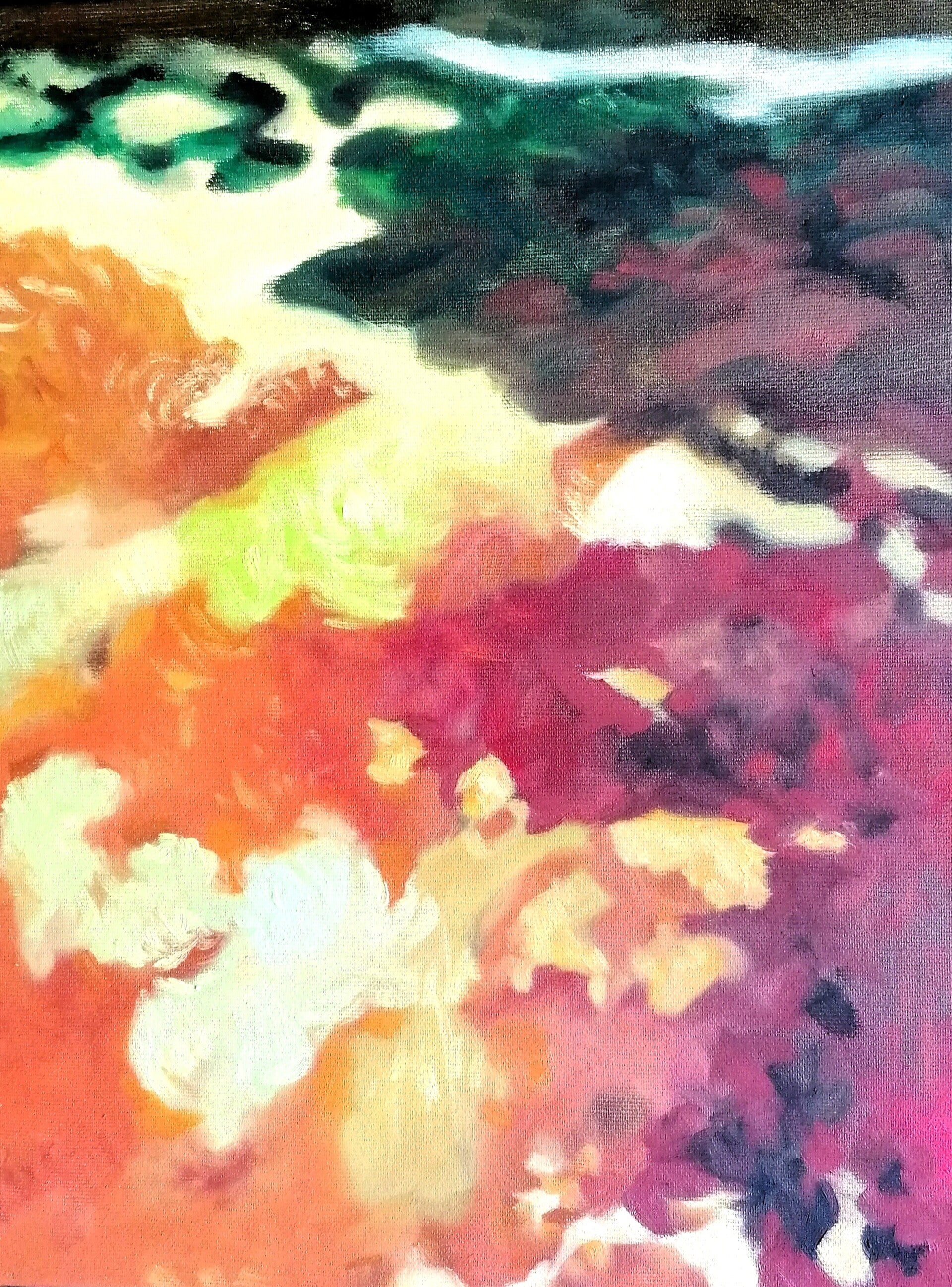 Sehr präsent sind mir der Blick aus dem Atelierfenster, der Fahrtwind bei der Abfahrt vom Berg, die Farben der Landschaft, des Waldes, die glitzernden Birken in struppiger Heide. Die schmackhaften Abendessen mit meinen Kompagnons und die beiläufigen, amüsanten Begegnungen mit dem Stifterpaar, die wundervollen, gemeinsamen Erkundungen der Umgebung. Das Arbeiten im Wechselklang, immer mal wieder einen Blick auf die Ertüchtigungen der anderen erhaschen. Mein Vorhaben, möglichst naturnah ins Malen zu kommen, konnte ich verwirklichen. Nach diesem Monat nehme ich zahlreiche Eindrücke mit nach Hause.